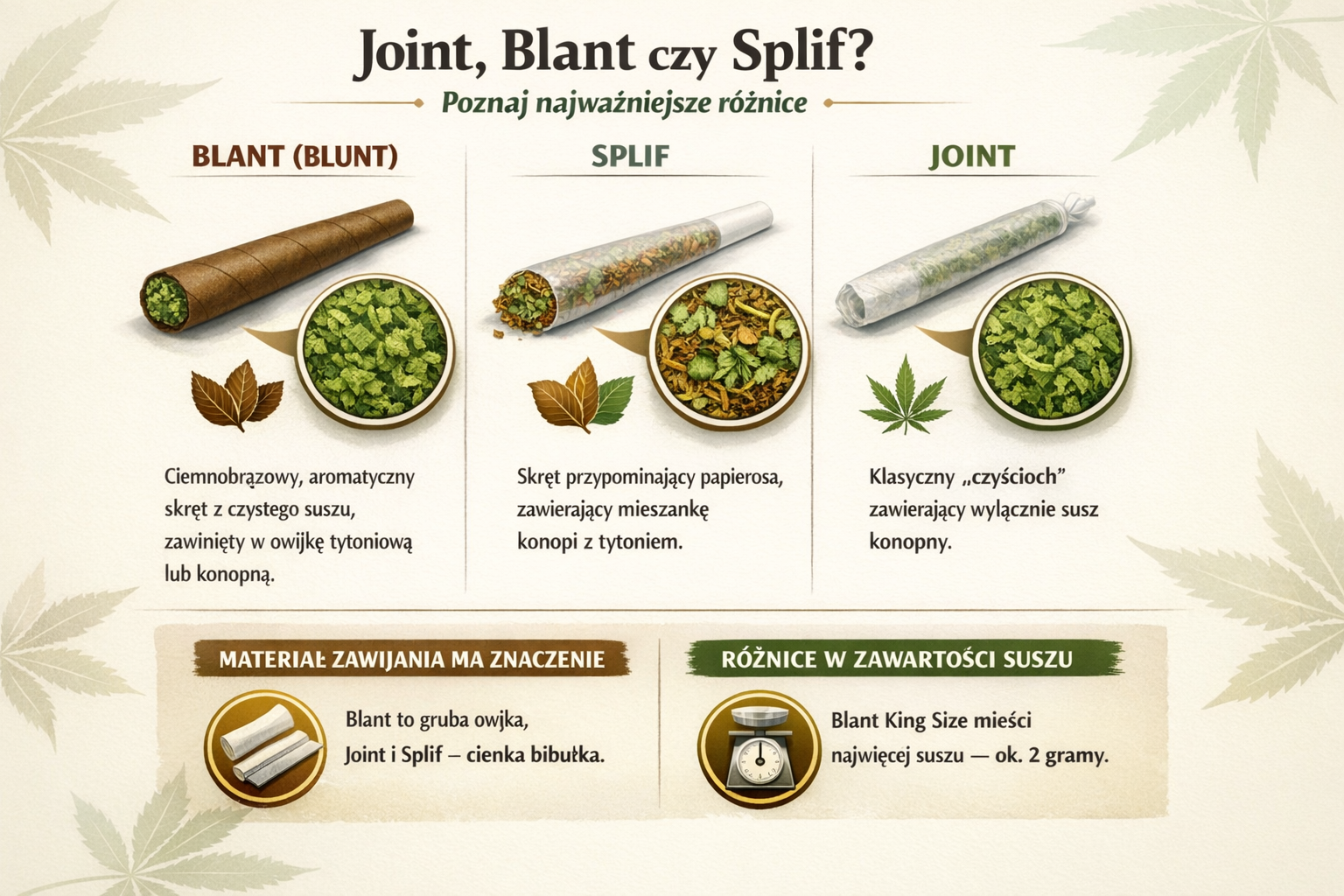 Główne różnice między jointami, blantami i splifami wynikają z rodzaju materiału użytego do zawijania oraz tego, czy środek wypełnia czysta marihuana, czy mieszanka z tytoniem. Wybór konkretnej formy zależy od preferencji smakowych oraz budżetu, ponieważ koszt skręta waha się od ok. 30 zł za splifa do nawet 100 zł za blanta, a wspólnym elementem wszystkich typów jest możliwość zastosowania filtra lub ustnika.
